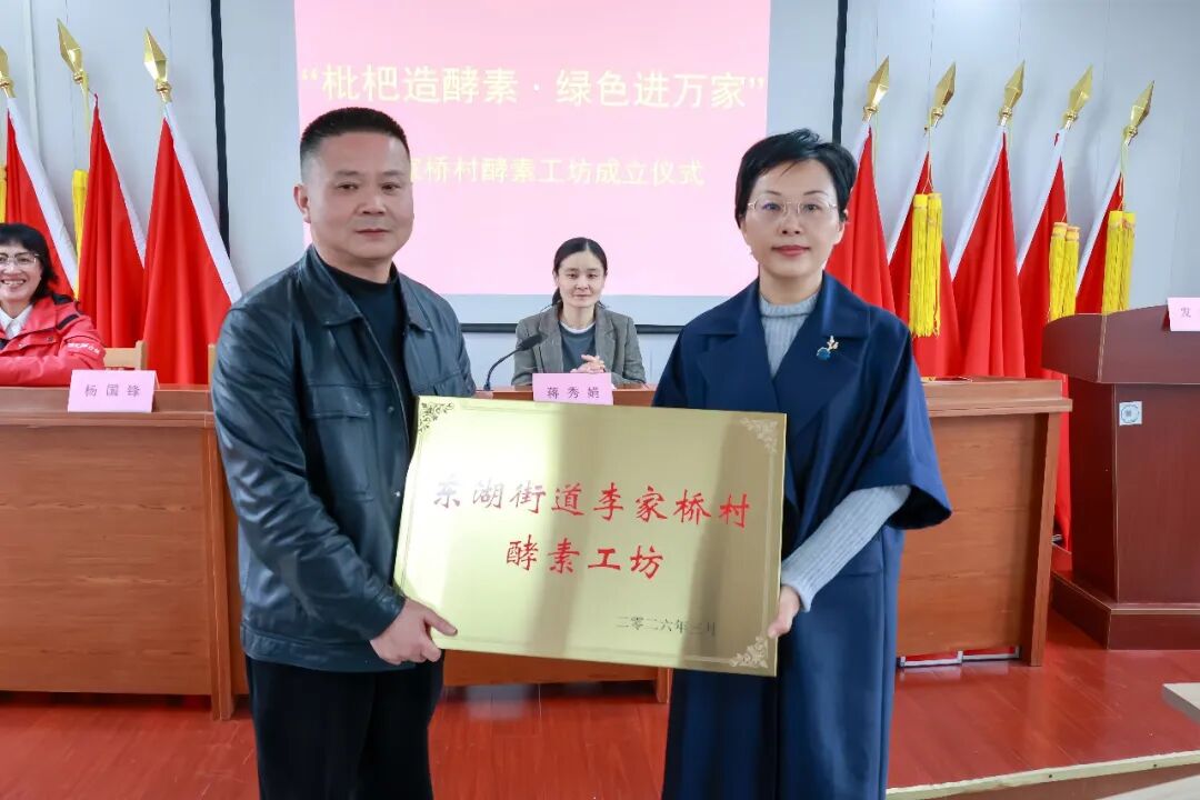 区妇联党组成员、副主席陶峥嵘,东湖街道办事处副主任蒋秀娟,东湖街道妇联专职副主席朱文琴,滴水公益组织负责人周晓燕,李家桥村书记、主任杨国锋等共同出席“酵素工坊”授牌仪式。“酵素工坊”的成立不仅标志着李家桥村在农业废弃物资源化利用上有了专属实践平台,更吹响了巾帼力量参与生态振兴的集结号,也为后续酵素工坊的规范化运营、常态化服务奠定了坚实基础。