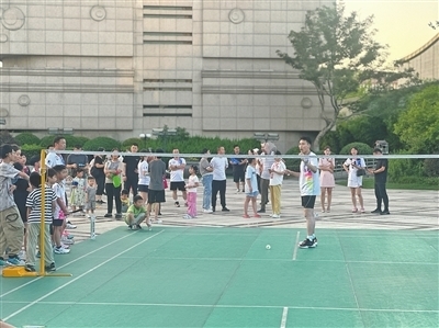 当天的羽毛球推广课精彩纷呈,专业教练团队为居民们带来了生动而实用的课程。教练们首先进行了羽毛球基础动作的示范,从握拍、发球到击球,每个动作都规范标准、清晰明了,引得不少居民踊跃参与,上前亲身感受羽毛球运动的魅力。在对抗表演、互动挑战环节中,尖羽球馆的小球员们进行了单打、双打对抗表演,吸引了不少成年居民们到球场上与之进行挑战,现场喝彩声此起彼伏。
