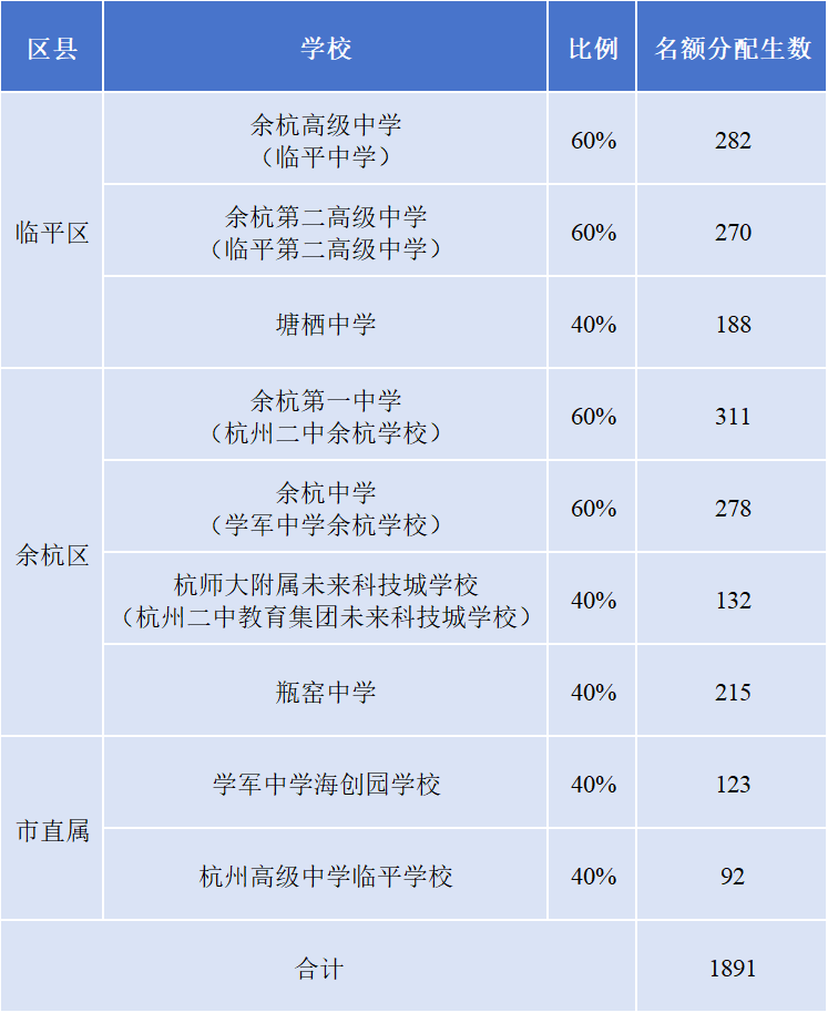 1891人!2024年临平区、余杭区普通高中名额分配招生公布