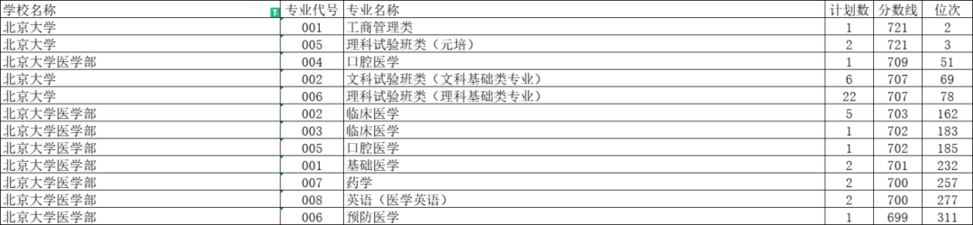 北京大学医学院,投档分数是699分,位次号是全省311,专业是预防医学。