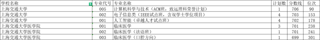 上海交通大学投档分数线是702分,投档位次号是全省178,专业是人工智能(卓越人才试点班)。上海交通大学医学院投档分数是699分,投档位次号是全省301,专业是临床医学(口腔方向)。