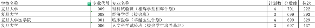复旦大学投档分数线是697分,投档位次号是全省437,专业是人文科学试验班(拔尖学生培养基地)。复旦大学医学院的投档分数是699,投档位次号是329,专业是临床医学(卓越医生计划)。
