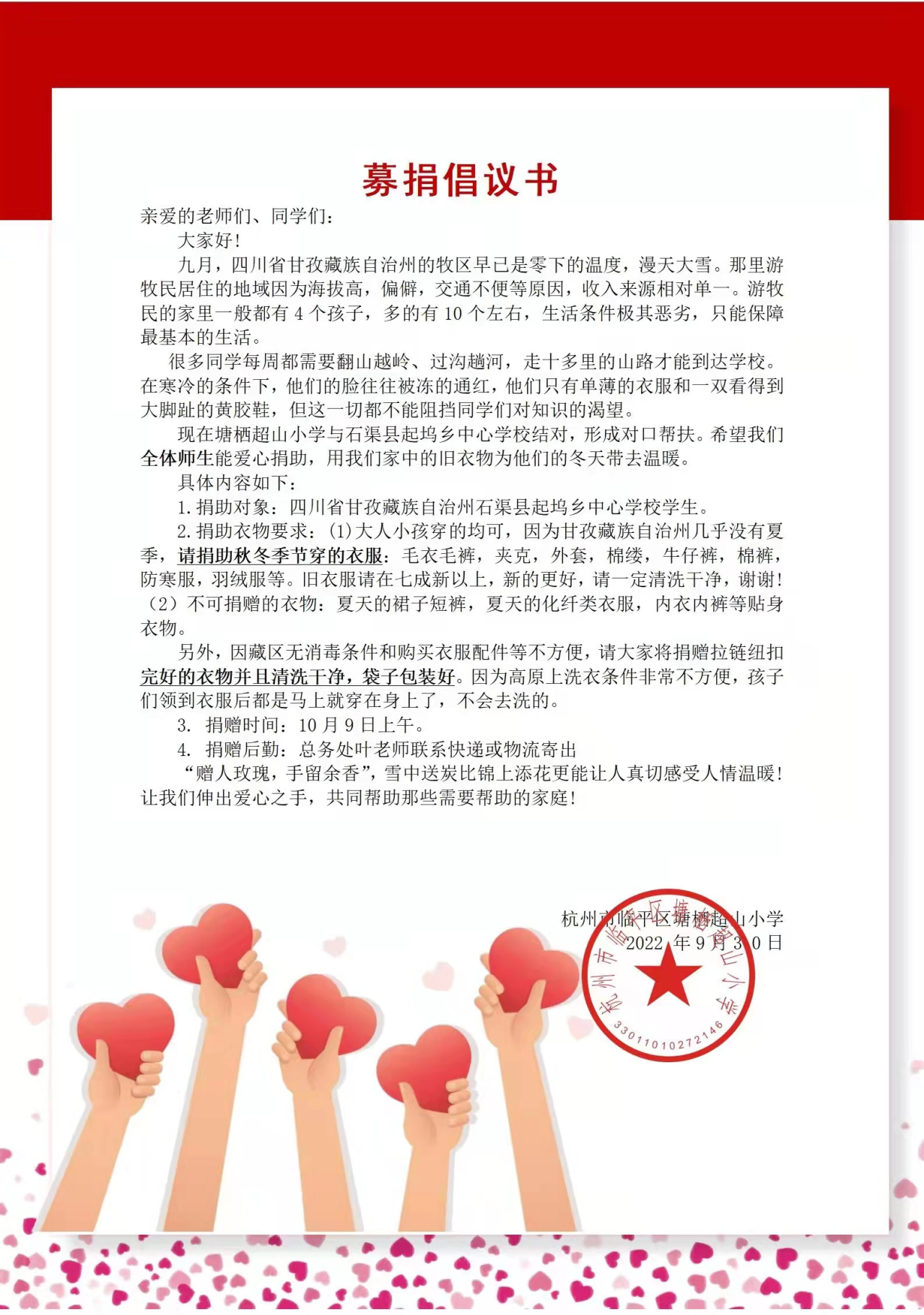 作为石渠县起坞乡中心校的结对学校,当临平区超山小学校得知起坞乡中心校的孩子们缺少过冬衣物时,迅速面向全校师生开展“让爱暖冬 情系石渠”冬衣捐赠活动。