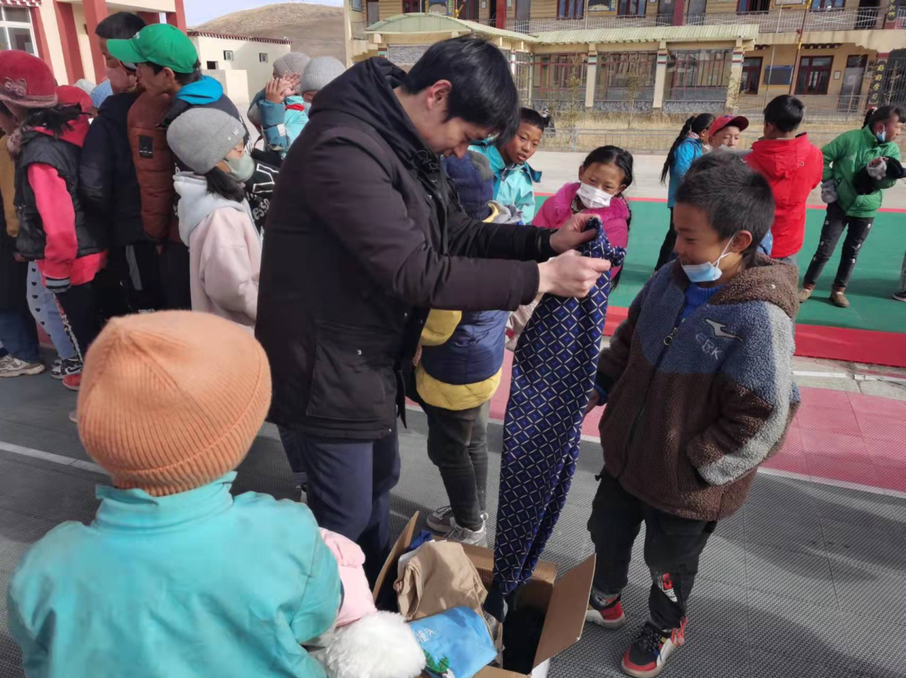 近日,临平区援派石渠县工作分队挂职老师前往起坞乡中心校,为该校学生分发临平区超山小学寄来的过冬衣物。