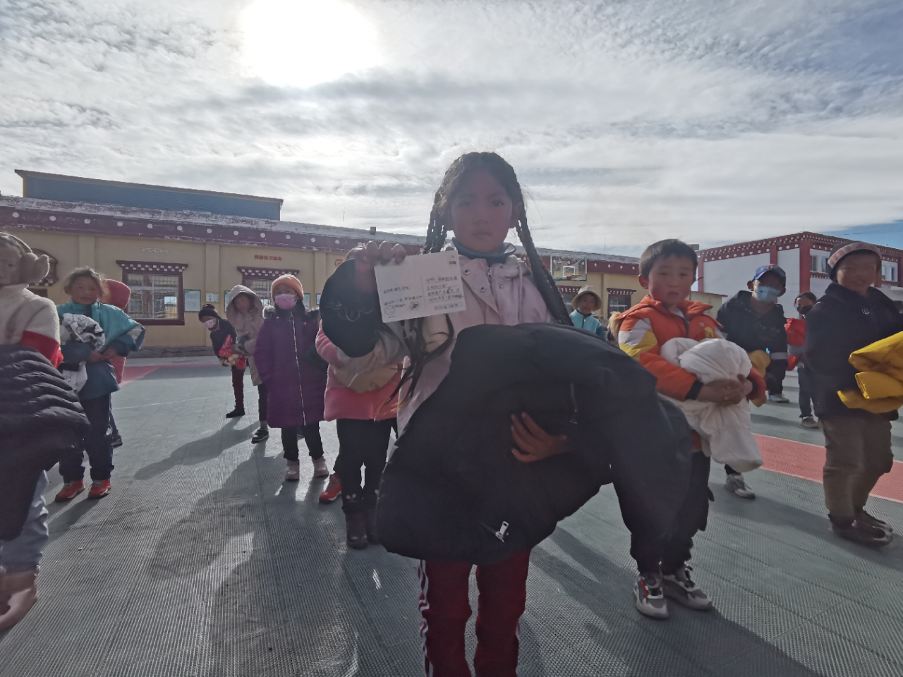 “感谢远方的同学们,新衣服很好看也很暖和,衣服里祝福的卡片我也收到了,相信今年的冬天不再那么寒冷”,石渠县起坞乡中心校卓玛拉姆小朋友说道。