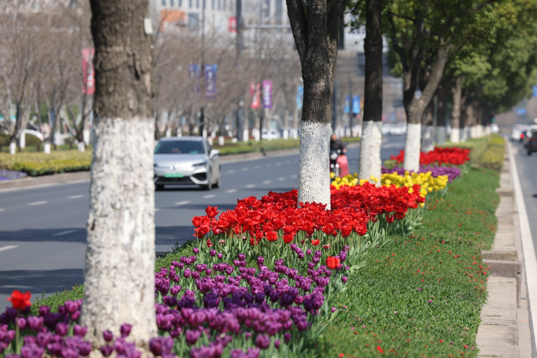 三月暖阳下,迎宾路的郁金香如约盛开,朵朵郁金香鲜艳欲滴,带来最浪漫的告白。现代化的高层建筑、川流不息的车辆和生机盎然的郁金香适配极了。