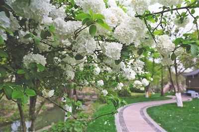 四月的超山,中华木绣球花开得恣意,走在其间,满是春日的清新感。 走进超山北园,雪白的绣球盛放,摇曳着满树繁花,极尽春之美事,小路在两旁绣球花的掩映下透着一种温柔。一团团的绣球花像是用最柔软的绸缎编织而成,在枝头轻轻摇曳。