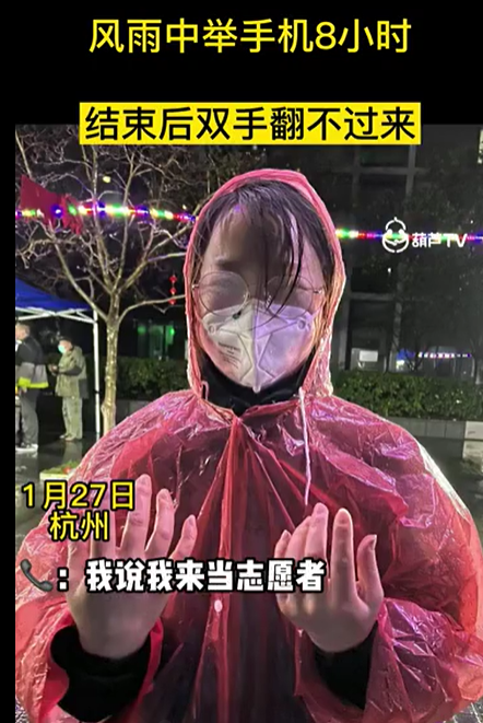 杭州滨江区疫情防控志愿者方爽,寒夜中连续工作8小时。她一直保持着往上拿手机的姿势,给大家扫码,等她把手机放下的时候,手已经翻不过来了。