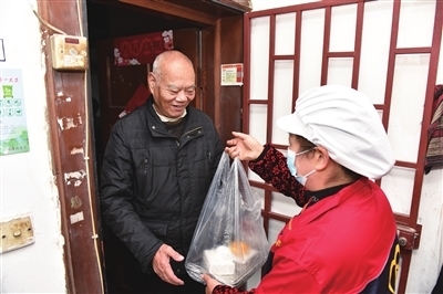 ④运河街道集中配餐中心工作人员为老人送餐上门