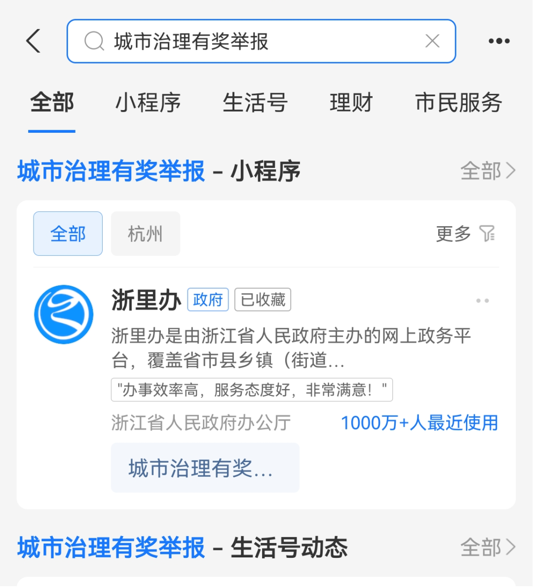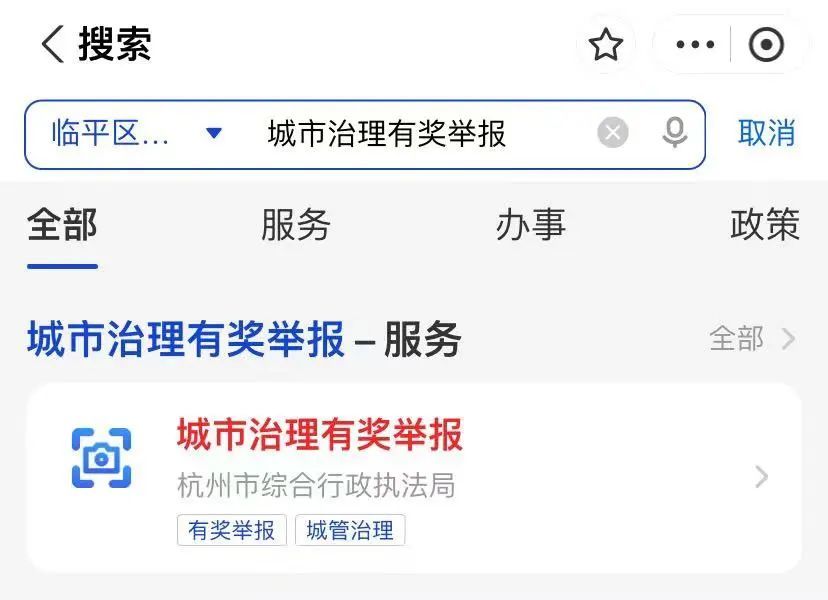 步骤1:在“支付宝”搜索“城市治理有奖举报”,进入浙里办“城市治理有奖举报”模块。