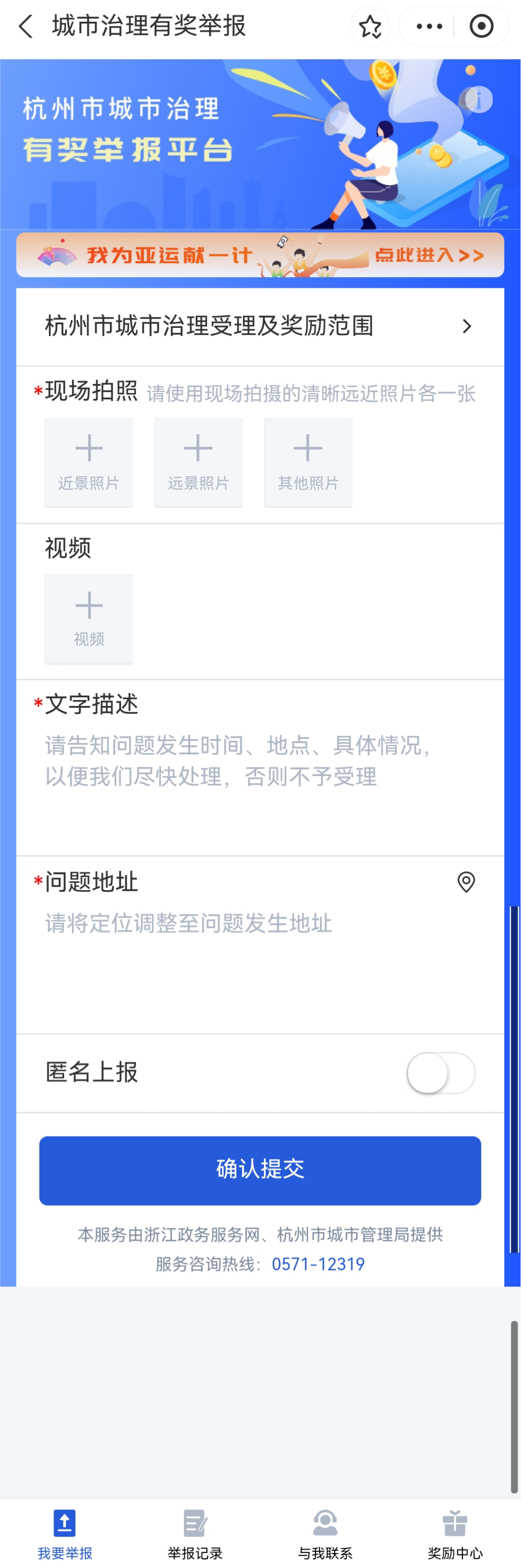 步骤2:进入“城市治理有奖举报”模块,根据提示上传图片或视频,并对举报内容进行简要描述,点击定位图标上传地址,点击“保存”完成提交。对属实线索将给予每条50元奖励,安全紧急100-500元,特别重大1-5万元。