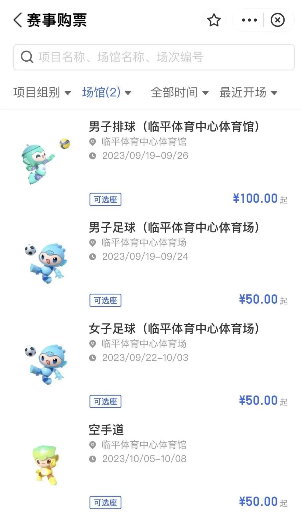 3.接着找到临平体育中心体育场和体育馆,根据想要观看的场次进行选择。