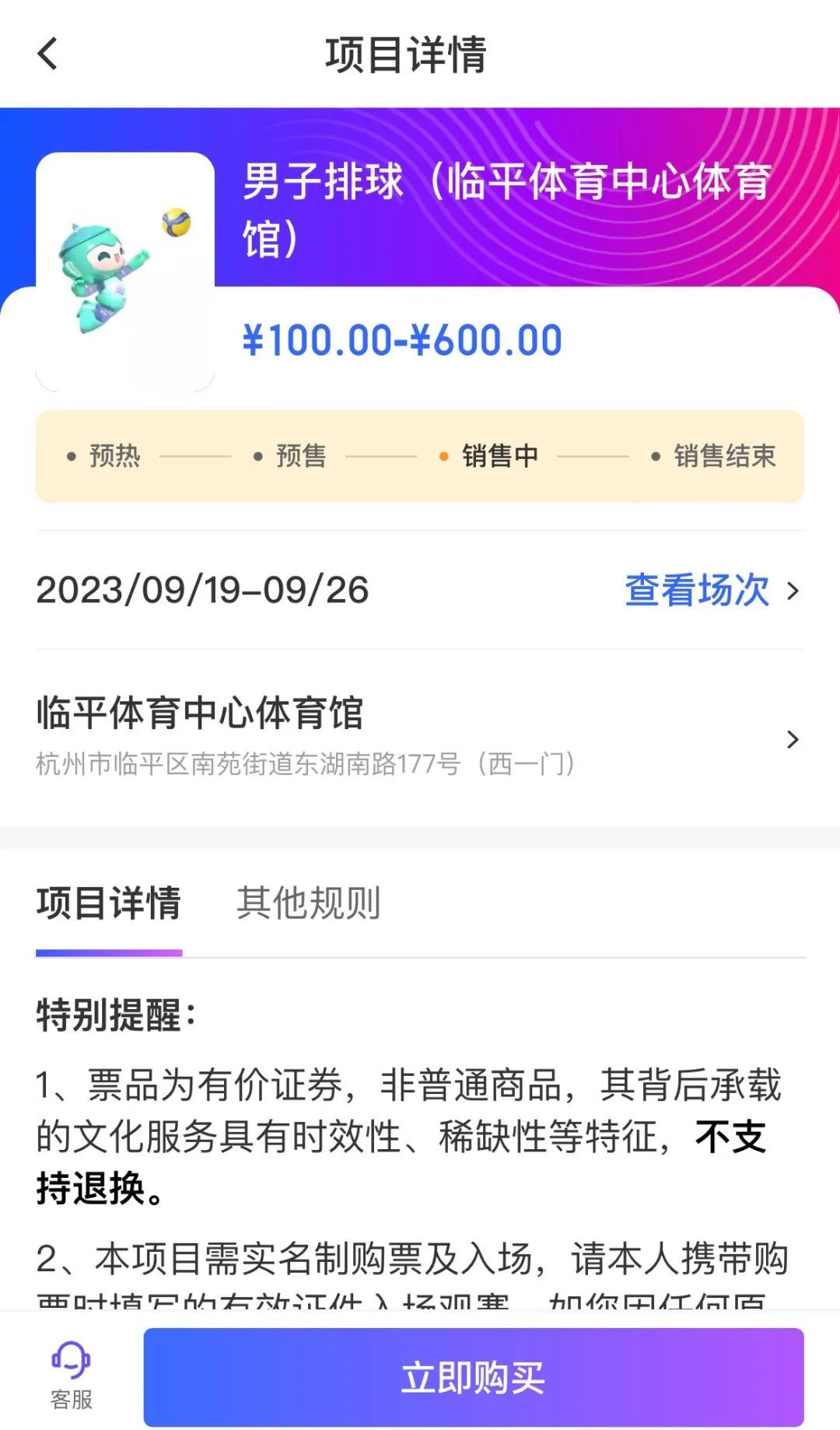 “我们临平体育中心场馆群里,几场热门赛事的票还是蛮紧俏的,比如说男子排球决赛、空手道热门场次都已经售完了。”工作人员介绍。据了解,亚运售票已经进入实时销售阶段,市民朋友可通过公众售票官网、“智能亚运一站通·票务通”、竞赛场馆售票亭等官方渠道购票。目前,线上、线下共享可售门票库存,线上显示售罄,线下同步无法购买。线下售票亭和服务网点只是作为线上售票的补充,主要为了方便不会使用智能手机的老年观众等群体。