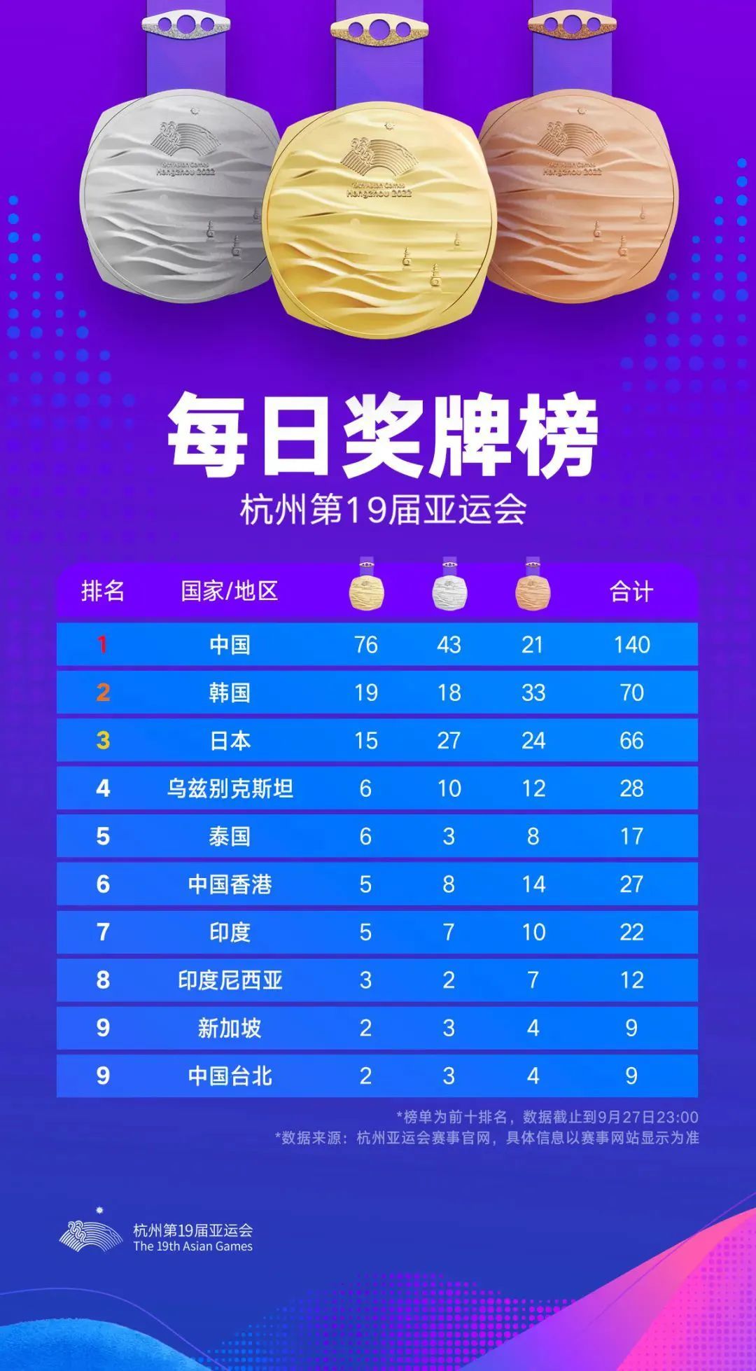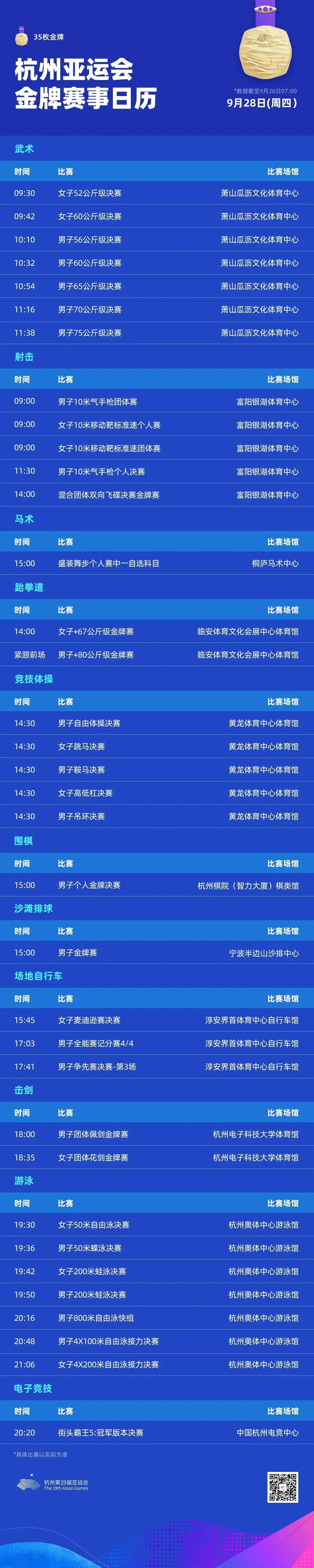 9月28日,杭州亚运会将产生35枚金牌,涉及武术、射击、马术、跆拳道、竞技体操、围棋、沙滩排球、场地自行车、击剑、游泳、电子竞技等11个项目。详见图: