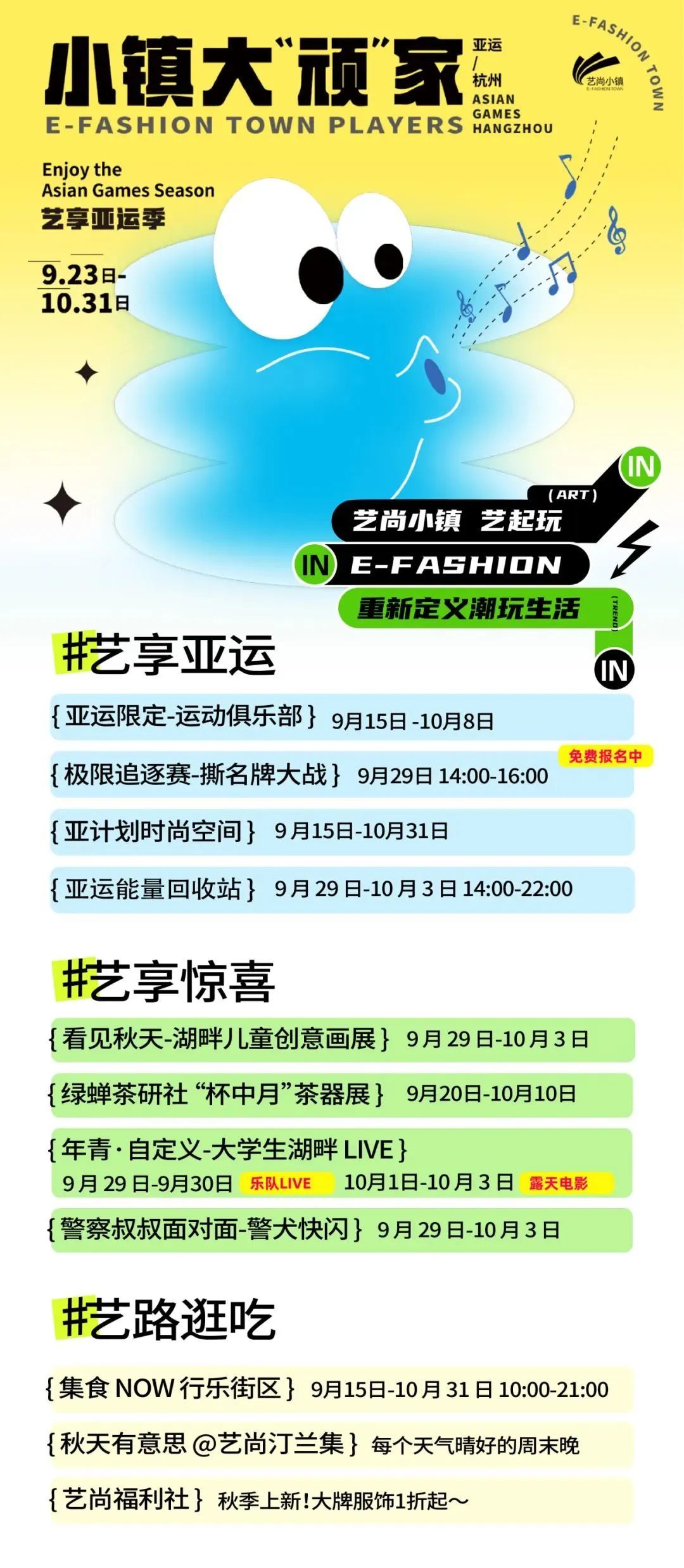 亚运互动、乐队LIVE、露天电影、创意市集……即日起至10月31日,艺尚小镇为大家准备好了一大堆活动,快去玩~