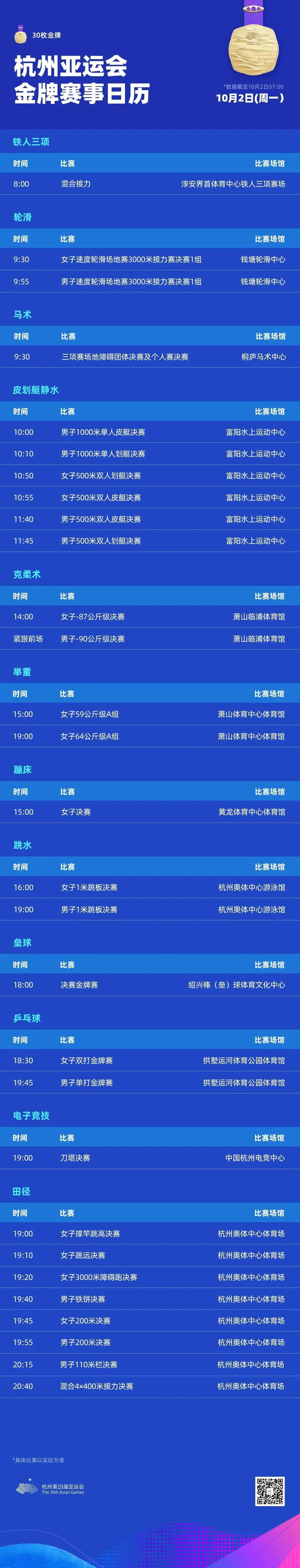 10月2日,杭州亚运会将产生30枚金牌,涉及铁人三项、轮滑、马术、皮划艇静水、克柔术、举重、蹦床、跳水、垒球、乒乓球、电子竞技、田径等12个项目。详情见图: