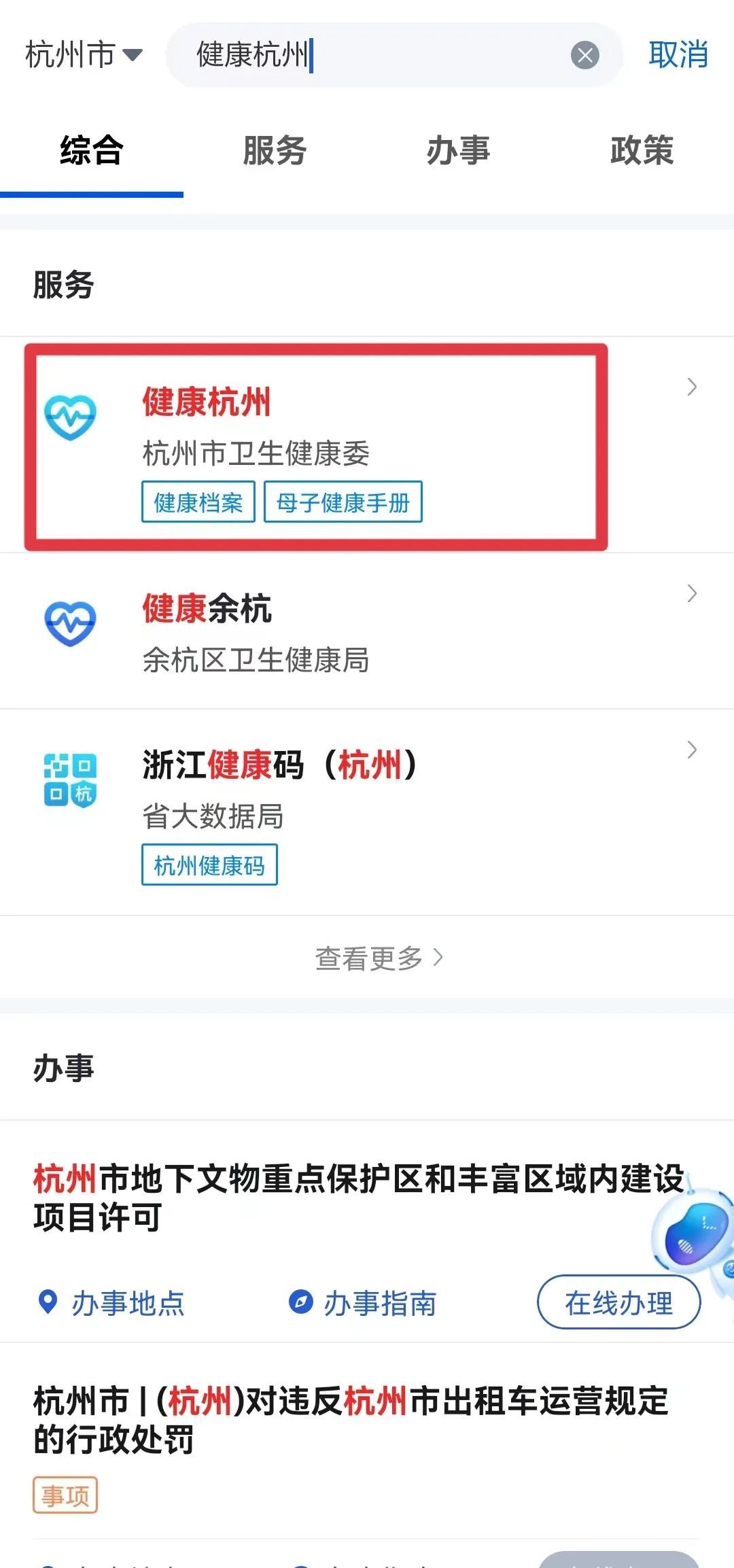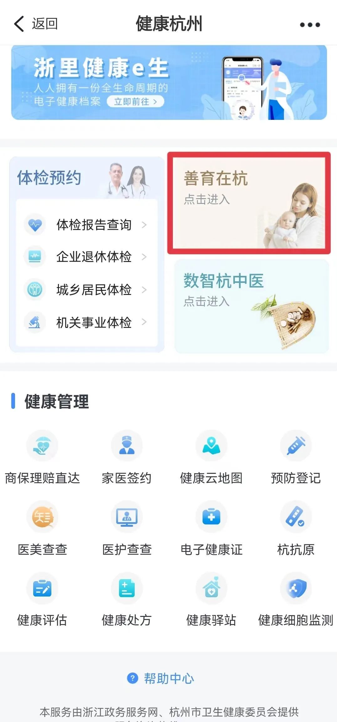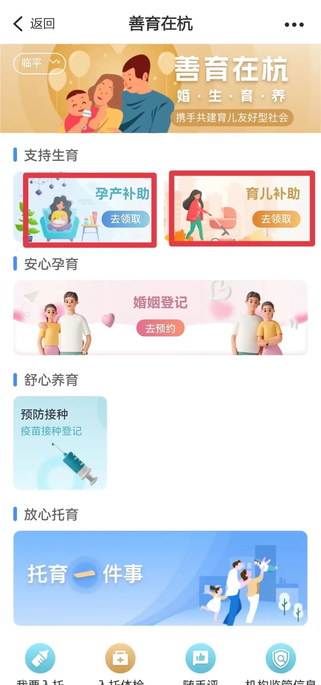浙里办APP—健康杭州—善育在杭—孕产/育儿补助。