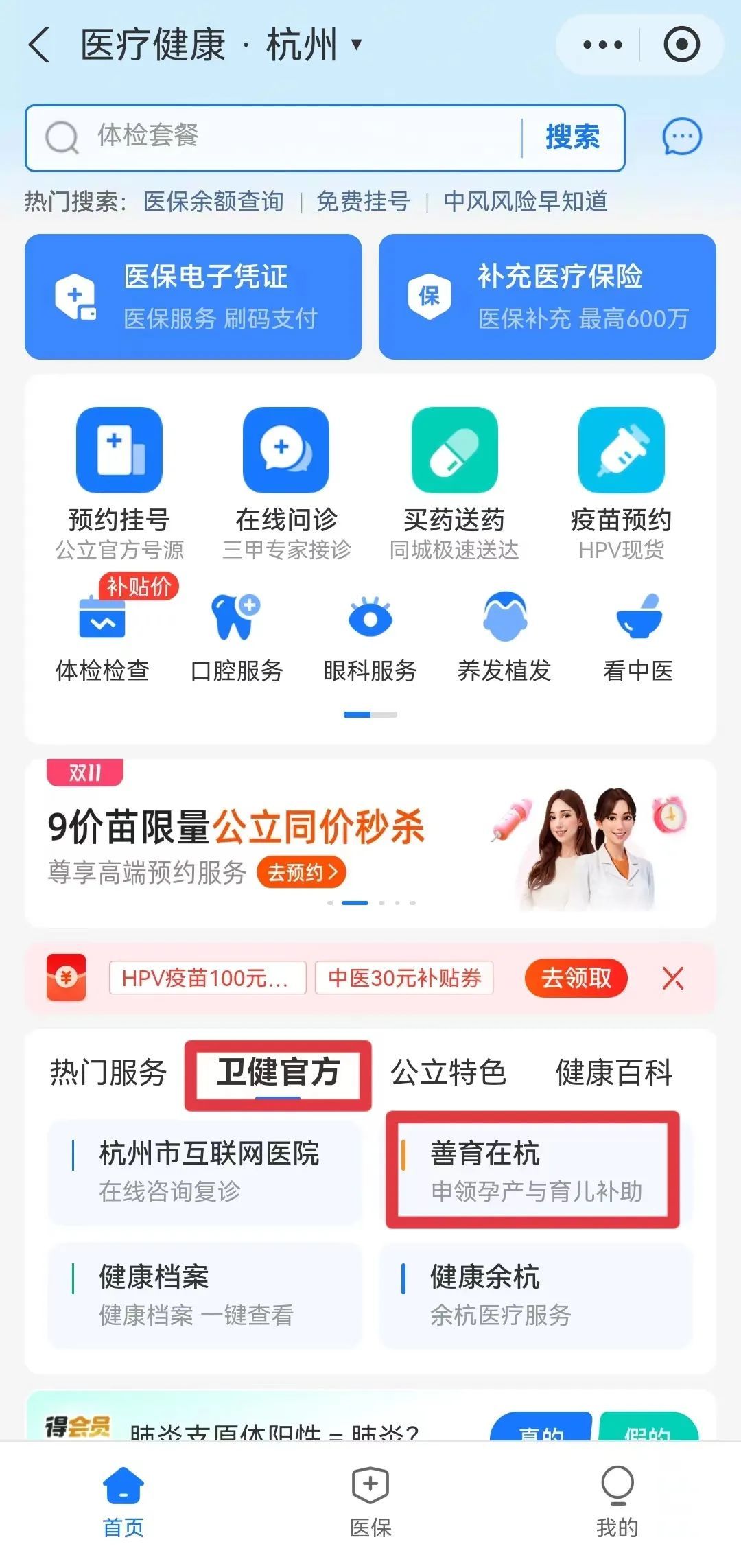 支付宝APP—医疗健康—卫健官方—善育在杭—孕产/育儿补助。