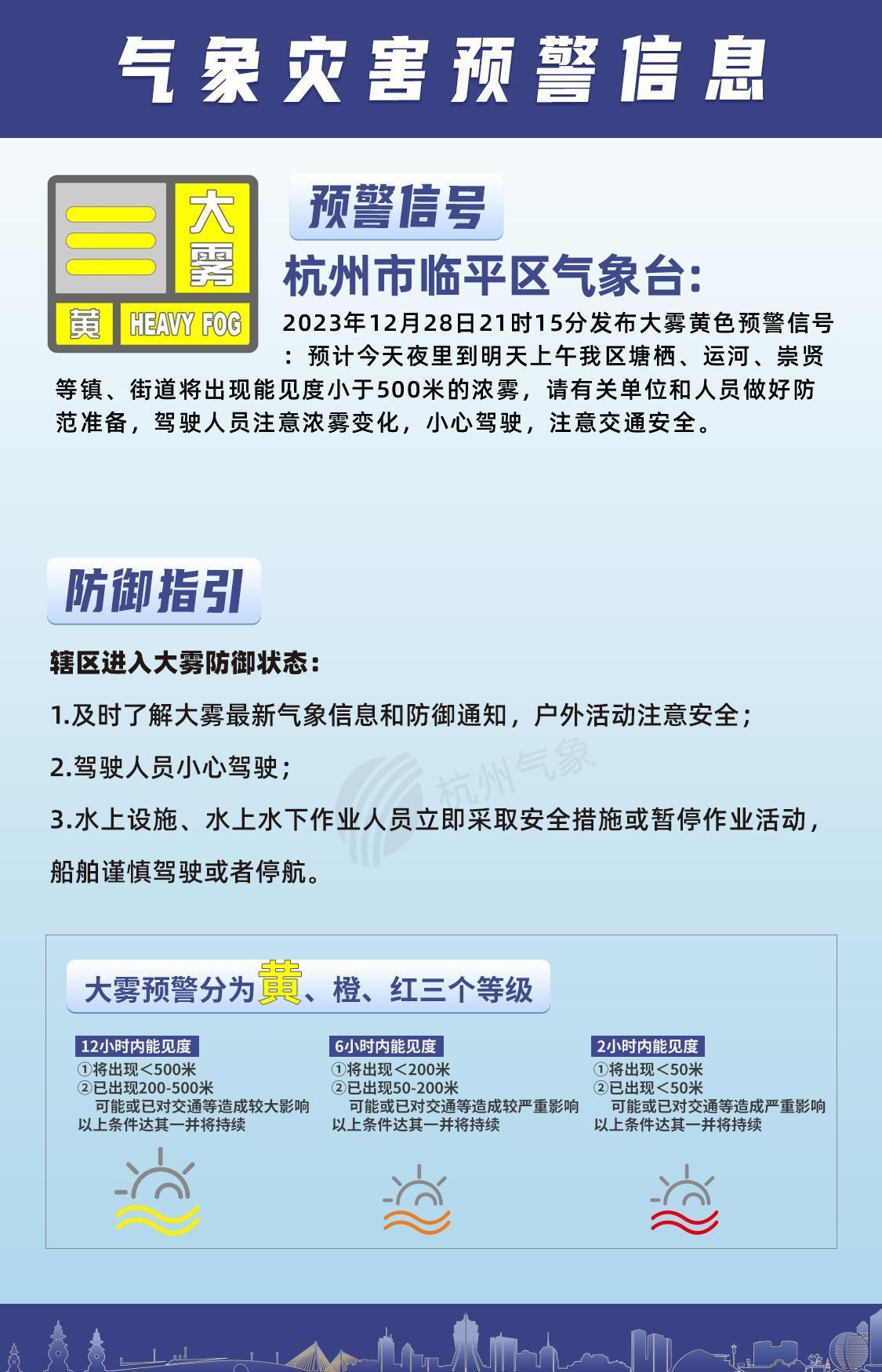 杭州市临平区气象台2023年12月28日21时15分发布大雾黄色预警信号:预计今天夜里到明天上午我区塘栖、运河、崇贤等镇、街道将出现能见度小于500米的浓雾,请有关单位和人员做好防范准备,驾驶人员注意浓雾变化,小心驾驶,注意交通安全。
