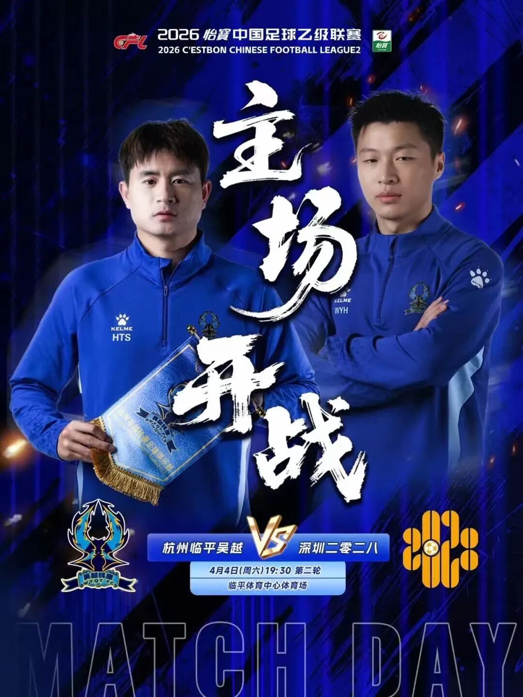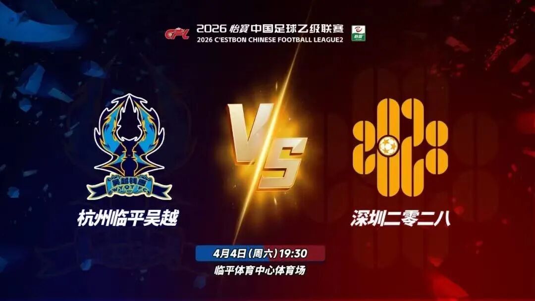 2026 赛季中乙联赛,杭州临平吴越新赛季主场首秀重磅来袭!4 月 4 日我们将直面强敌深圳二零二八,一场针尖对麦芒的绿茵对决,即将点燃整座临平的足球热情!