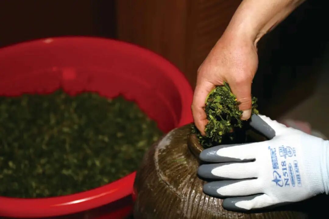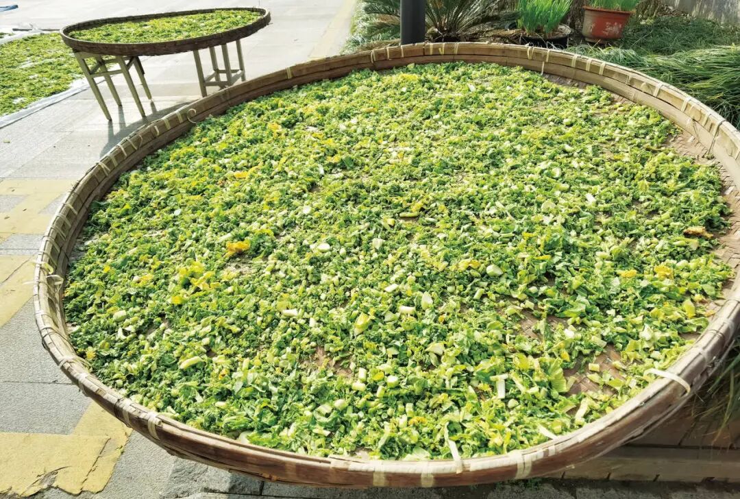 芥菜成熟收割后,整株清洗晾晒堆黄,然后切碎摊平晾晒。晒至八九分干时,加盐反复搓揉,直至菜变得软软蔫蔫,便可装入菜甏,利用菜脚压实,密封倒置储存个把月即可随取随食