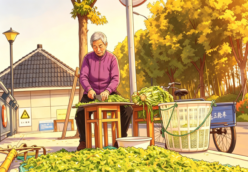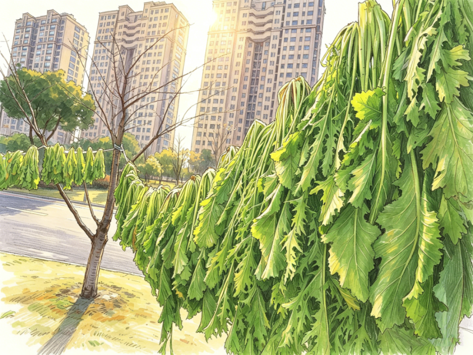 一个春光明媚的日子,我随父母回老家。回迁安置的小区里随处可见芥菜的身影,它们被晾在树上、架起的竹竿上或晾衣竿上,齐齐整整,蔚为壮观;有晾干后堆在架空层的,有切碎摊在竹匾里、旧竹席或塑料布上的……又到了一年一度做甏菜的日子。在门口遇见二伯,他乐呵呵地和父亲打招呼,说天气好,他正要去地里倒芥菜。记得小时候,二伯每年都会做很多甏菜,我们家要是不够吃,我就会拿着碗去二伯家摸上一碗,那抹鲜咸的味道至今深刻于我的脑海里。我跟随二伯来到一畦油绿的长方形菜地,一株株茎壮叶肥的芥菜在春光里肆意生长,他拿起镰刀专注地收割着芥菜,每一刀都精准而有力,嫩绿的芥菜被整齐地堆在田埂边,吸收着春的气息。倒完菜,二伯将它们挑回家,切除多余的菜根,捡出枯叶、烂叶以及杂草,放到水池里清洗干净,再一株株倒挂在绳子上晾晒。