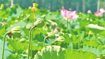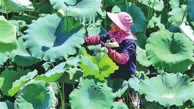 走进崇贤村,荷塘里一个个莲蓬伫立在水中,有的昂首挺立,有的藏身在荷叶下,经验丰富的采莲人穿梭其间,采摘成熟度最佳的莲蓬。